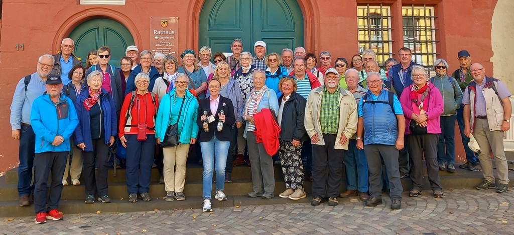 Am Nachmittag war Bad Münstereifel unser Ziel. Mit ihren Fachwerkhäusern und der fast kompletten Stadtmauer gilt die Stadt als Kleinod. Eine besondere Note erhielt der Besuch mit der Begrüßung der Gruppe durch die Bürgermeisterin Frau Preiser-Marian vor dem „Roten Rathaus“. Durch ihren kurzen Abriss zur aktuellen Situation des Ortes erfuhren wir, dass der Ort 2014 als Outlet Center gestaltet wurde bei dem in der Innenstadt die Geschäfte dafür genutzt werden. Damit gelang es die Innenstadt nach dem Aussterben bzw. Abwandern der Geschäfte wiederzubeleben. Beim Eifelhochwasser im Juli 2021 wurde die Altstadt durch die Flutwelle der Erft massiv beschädigt. Die Innenstadt wurde inzwischen saniert, aber es sind laut der Bürgermeisterin weiterhin große Anstrengungen erforderlich um die verbleibenden Schäden zu beheben.
